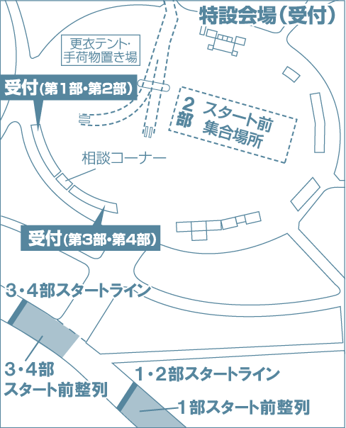 スタート15分前を目途に、スタート地点に直接整列してください。